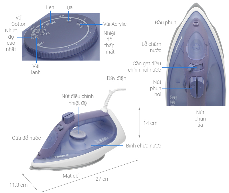 - Gồm 4 chức năng ủi khô, ủi hơi nước, phun hơi, phun tia