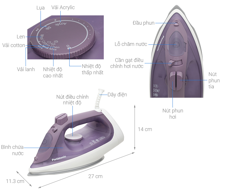 - Gồm 4 chức năng ủi khô, ủi hơi nước, phun hơi, phun tia
