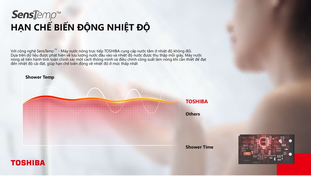 Công nghệ Hạn chế biến động nhiệt Không ngừng theo dõi và điều chỉnh nhiệt độ nước một cách chính xác từng giây. Nhờ khả năng thu thập dữ liệu về lưu lượng và nhiệt độ nước tức thời, máy tắm nước nóng Toshiba luôn đảm bảo nhiệt độ ổn định và tiết kiệm điện năng.
