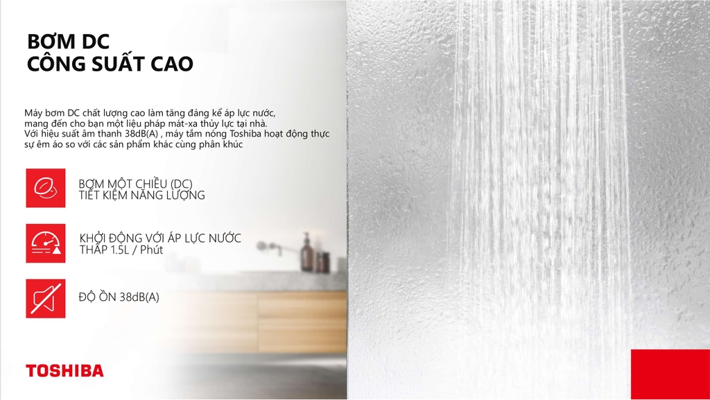 Công nghệ Trải nghiệm thư giãn Máy bơm DC giúp tăng áp lực nước mạnh mẽ, mang đến cảm giác sảng khoái như đang tận hưởng liệu pháp thủy lực tại spa. Với độ ồn chỉ 38dB(A), máy tắm nước nóng Toshiba hoạt động êm ái hơn nhiều so với các loại máy bơm truyền thống, mang đến không gian yên tĩnh tuyệt đối.