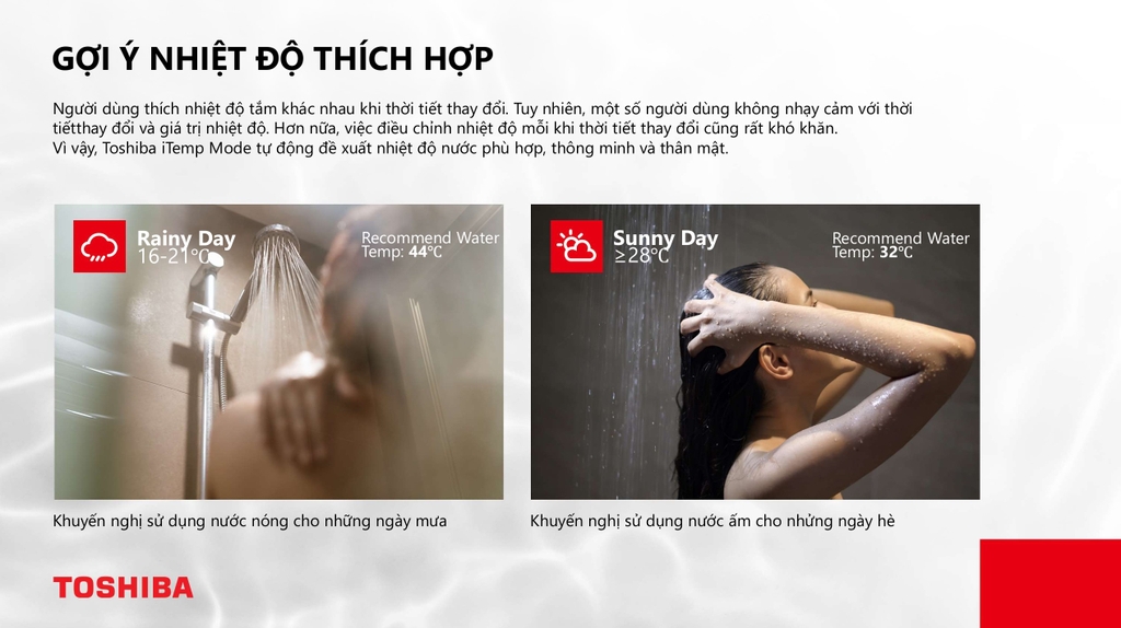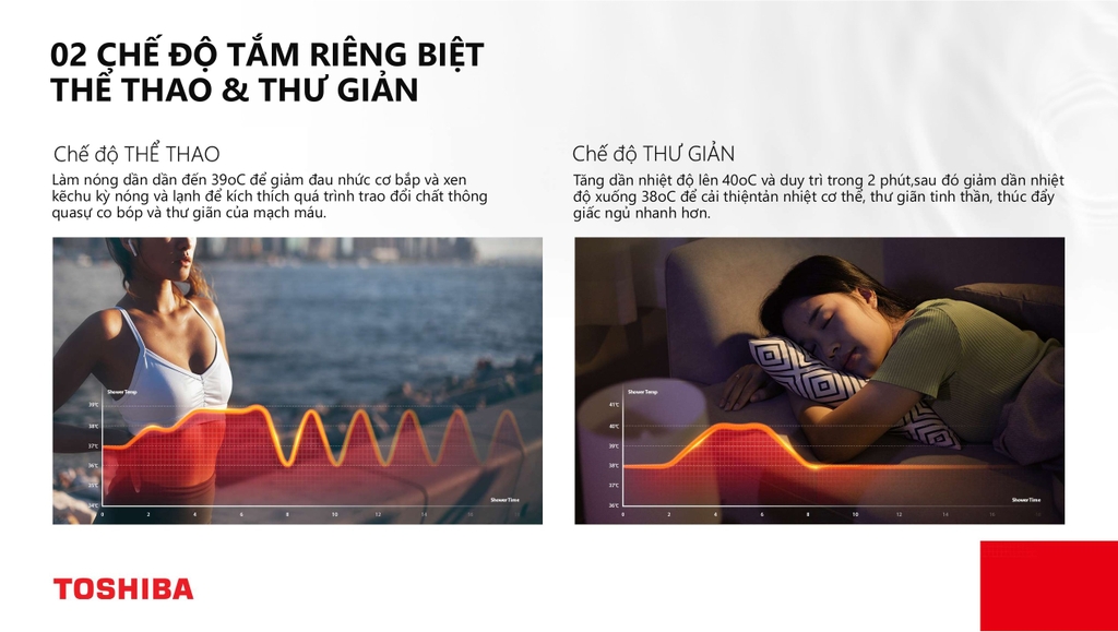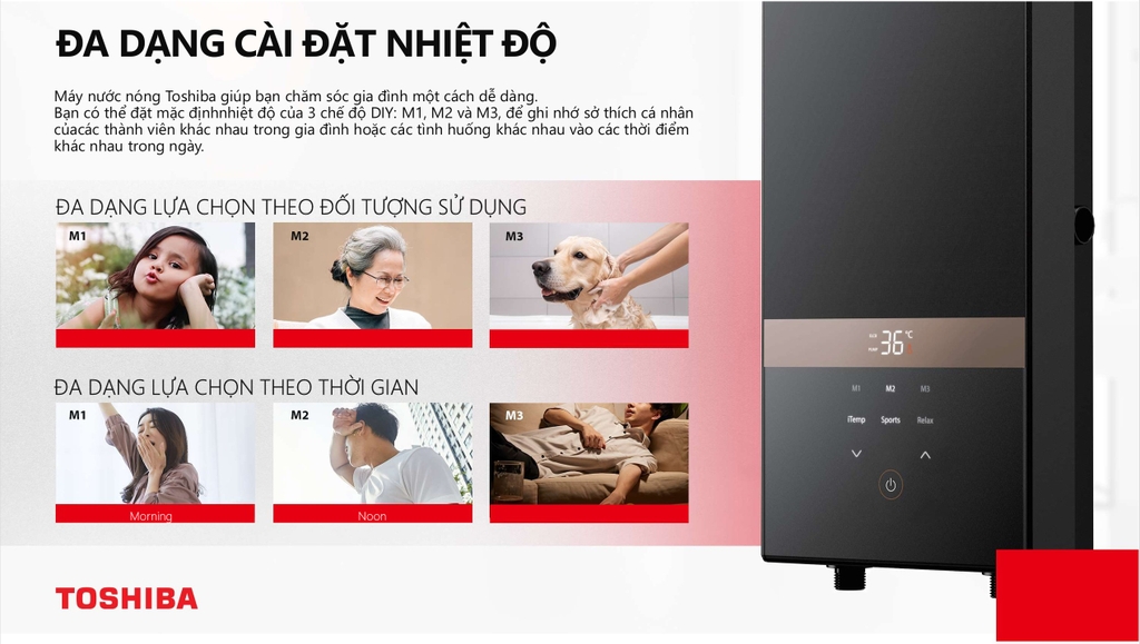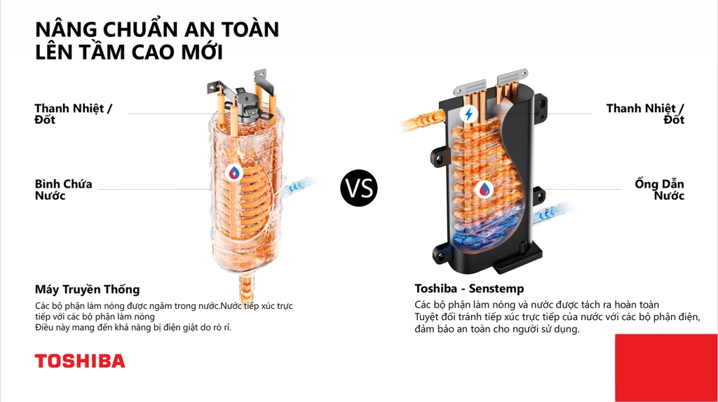 - Bảo vệ gia đình bạn với máy tắm nước nóng Toshiba. Công nghệ cảm biến và điều chỉnh nhiệt độ thông minh giúp tránh bỏng, đặc biệt an toàn cho trẻ nhỏ. Cảm biến lưu lượng & Nhiệt độ nguồn nước: Phát hiện lưu lượng dòng chảy và nhiệt độ chính xác của nguồn nước đầu vào tức thì. Thanh nhiệt tách rời nguồn nước: Tự động điều chỉnh công suất làm nóng phù hợp mới mức nhiệt độ lựa chọn. Chip xử lý thông minh - tiện lợi: Tính toán và điều khiển các hoạt động của máy một cách hợp lý và nhanh chóng.