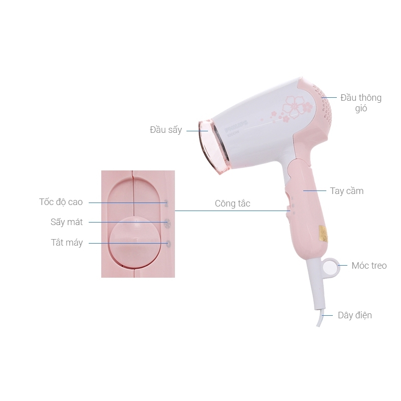 Tiện ích: Có móc treo, Đầu sấy hẹp tạo kiểu tóc