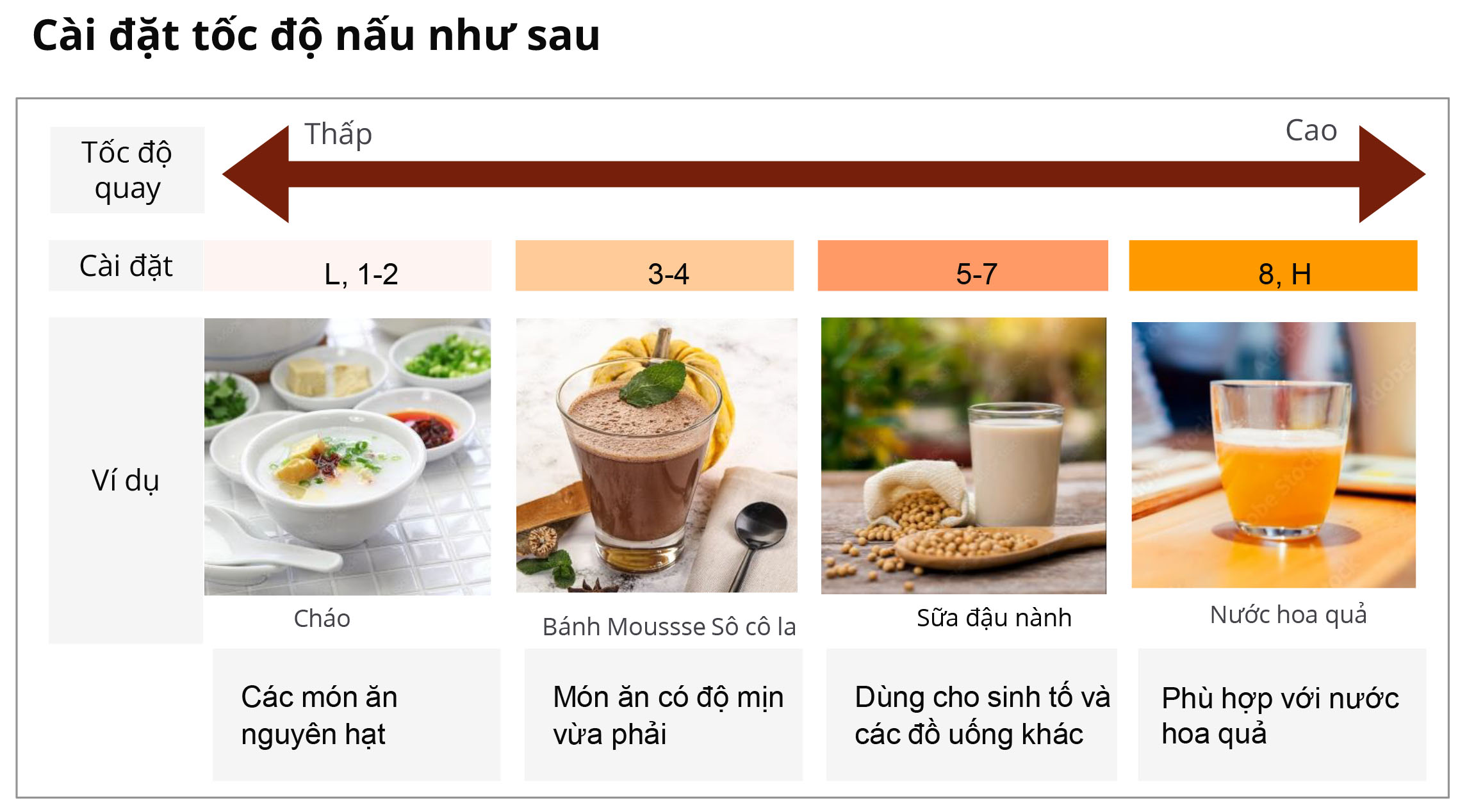 Chế độ thủ công thì bạn có thể điều chỉnh tốc độ xay tùy theo món ăn bạn muốn chế biến, từ cháo đến các đồ uống mịn như sữa đậu nành hoặc nước trái cây tươi.