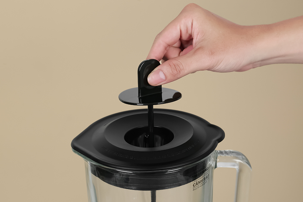 - Nắp nhỏ tiếp nguyên liệu khi xay có thể dùng như cốc đong dung tích 50 ml.