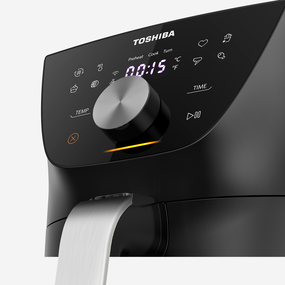 Nồi chiên không dầu Toshiba được trang bị bảng điều khiển cảm ứng có tích hợp đèn hiển thị trạng thái hoạt động của nồi, giúp bạn theo dõi chính xác các giai đoạn nấu đang diễn ra: