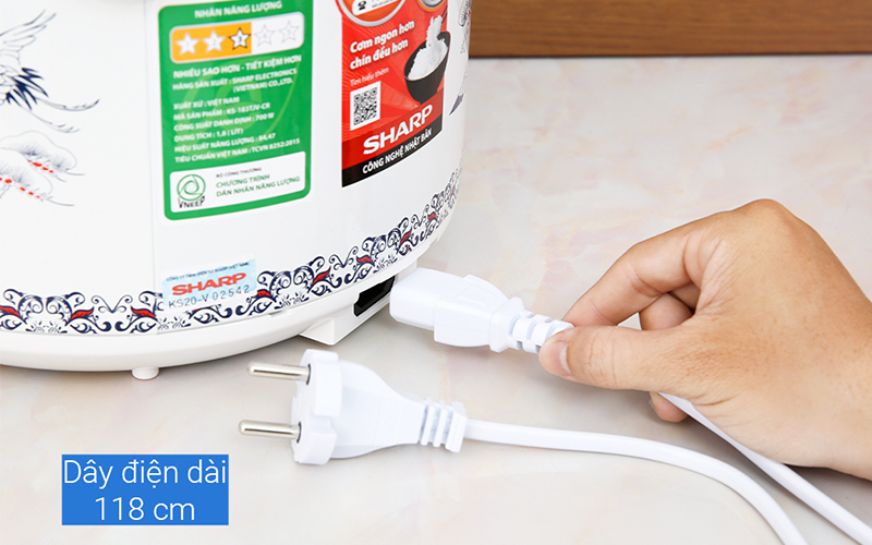 Dây điện dài 118cm có thể tháo rời, thuận tiện cho việc di chuyển và bảo quản nồi cơm điện gọn gàng.