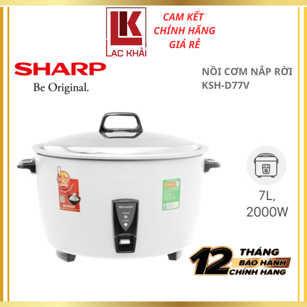 Nồi cơm nắp rời Sharp 7 lít KSH-D77V nhập khẩu từ Thái Lan, nấu cơm chín nhanh nhờ công nghệ nấu 1D, dung tích lớn 7 lít, nút gạt dễ thao tác,... hỗ trợ chế biến khẩu phần cơm cho gia đình đông người hay quán ăn.