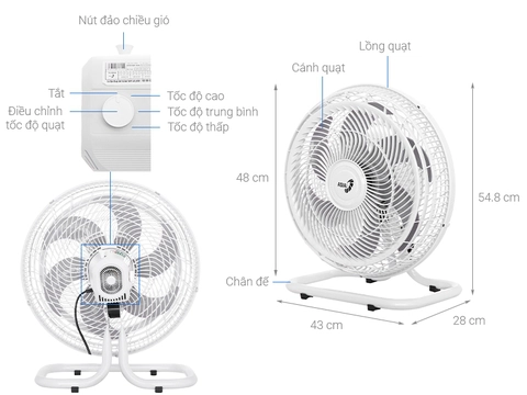 Điều chỉnh tốc độ quạt với 1 nút vặn (tốc độ thấp-trung bình-cao). Có nút đảo chiều gió để bật quạt quay.